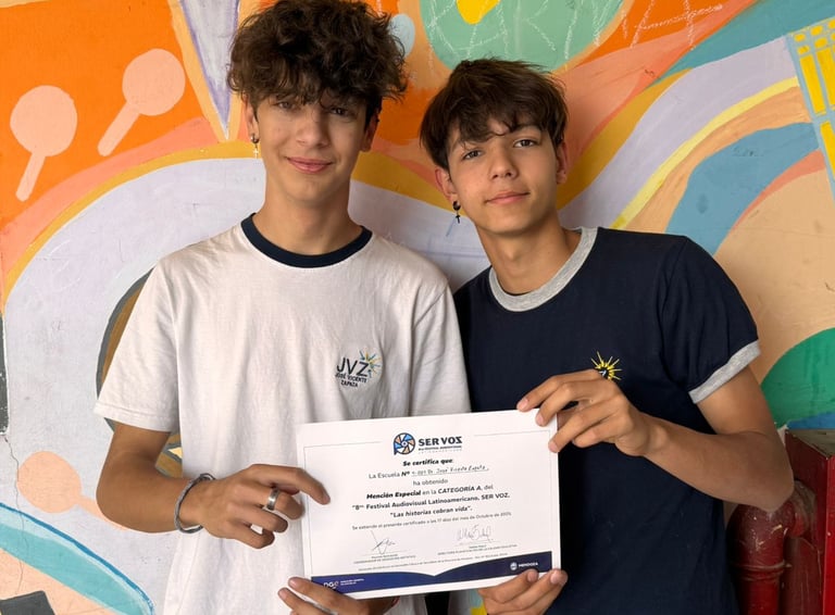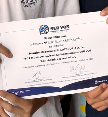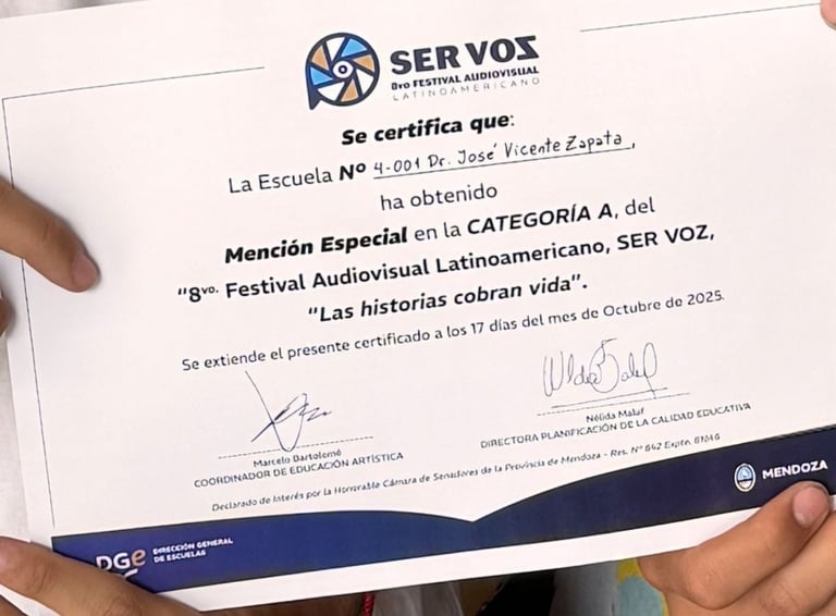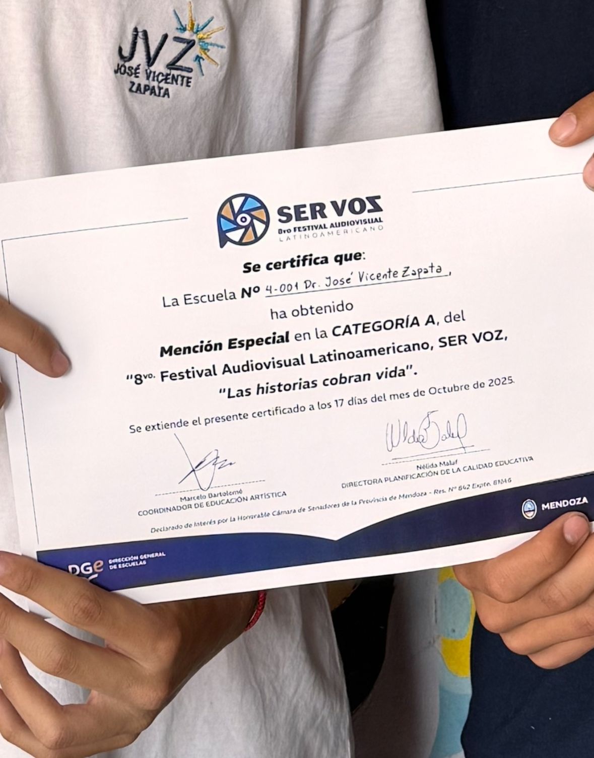 Estudiantes de cuarto quinta y quinta quinta del Bachiller en Artes Audiovisuales de la Escuela Nº 4-001 Dr. José Vicente Zapata recibieron una Mención Especial en la 8ª edición del Festival Audiovisual Latinoamericano “Ser Voz”, bajo el lema “Las historias cobran vida”. El certamen buscó promover la lectura y la identidad cultural mendocina a través del cine, invitando a las escuelas a adaptar obras de autores locales.