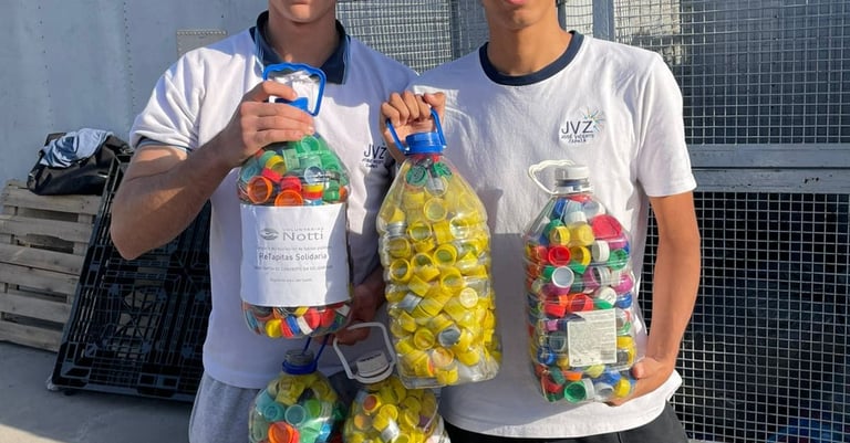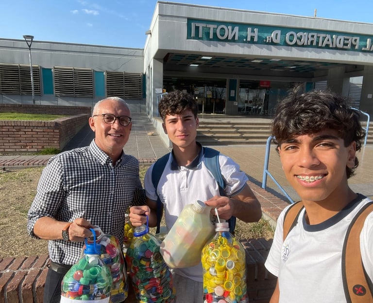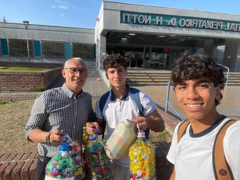 Enzo y Thomas, de 5.º año del Bachiller en Ciencias Naturales, lideraron una colecta de tapitas plásticas en la escuela para colaborar con las Voluntarias del Hospital Notti. 🏫🤝 La propuesta convocó a cursos y docentes, y reunió cientos de tapitas que se entregaron para su reciclaje. 📦➡️🔁 Gracias a este circuito solidario, los materiales recuperados se transforman en recursos que mejoran la calidad de vida de las niñas y los niños que se atienden en el hospital. 🧒👧💙