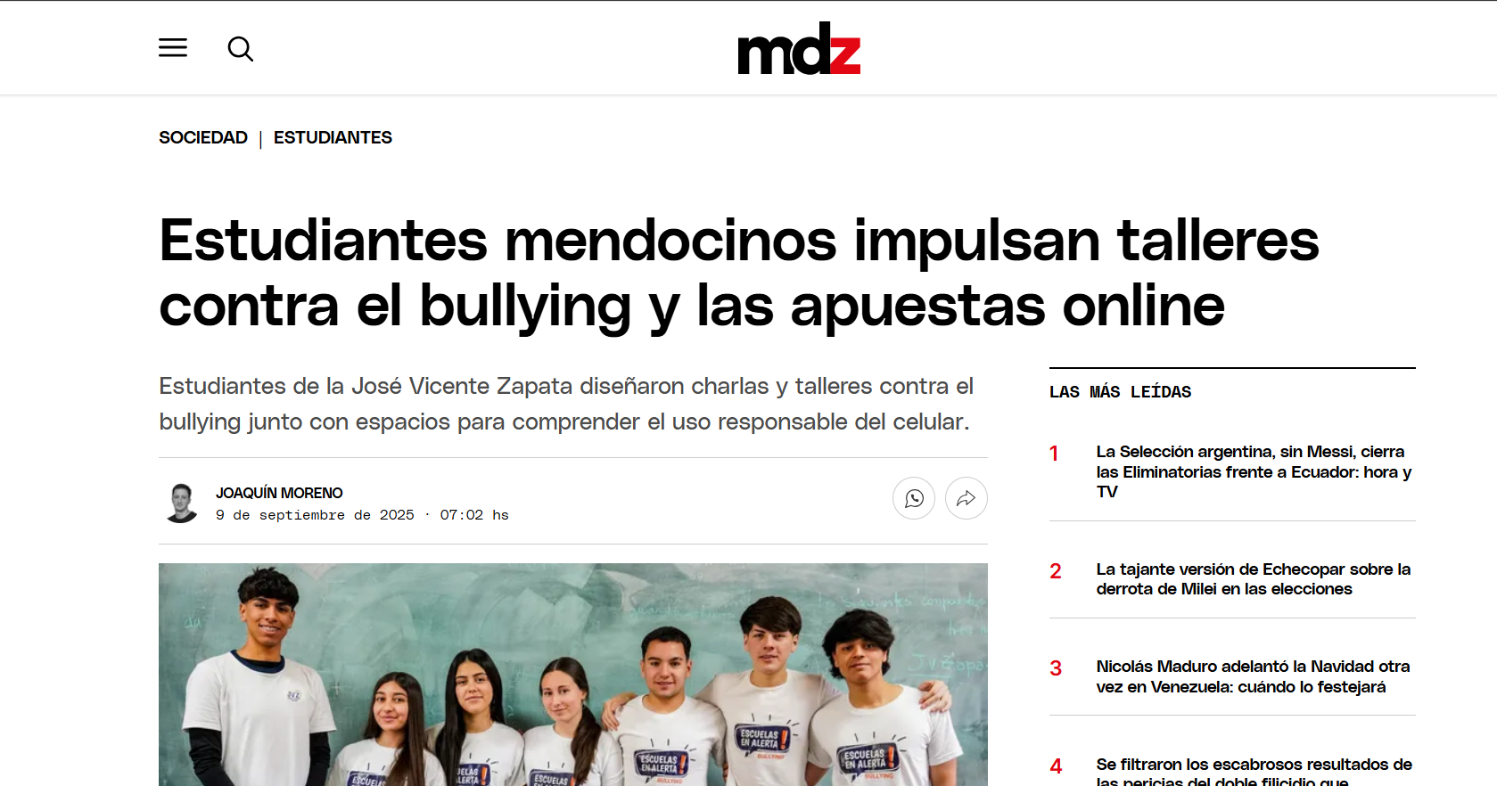 Estudiantes de cuarto y quinto año de la Escuela Dr. José Vicente Zapata —una institución pública de referencia en la ciudad de Mendoza, reconocida por su innovación pedagógica y formación integral escuelajvzapata.org escuelajvzapata.org — han iniciado dos talleres dirigidos a sus pares, centrados en la prevención del bullying, el ciberbullying, el uso responsable del celular y los riesgos de las apuestas online.