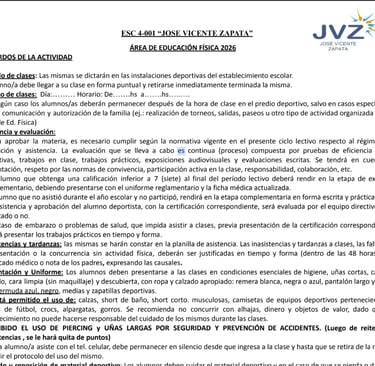 La Escuela 4-001 Dr. José Vicente Zapata informa a toda su comunidad educativa que ya se encuentran disponibles para su descarga y consulta dos documentos fundamentales del Área de Educación Física, pensados para acompañar el inicio del presente ciclo lectivo y fortalecer el trabajo conjunto entre la escuela, los estudiantes y las familias.